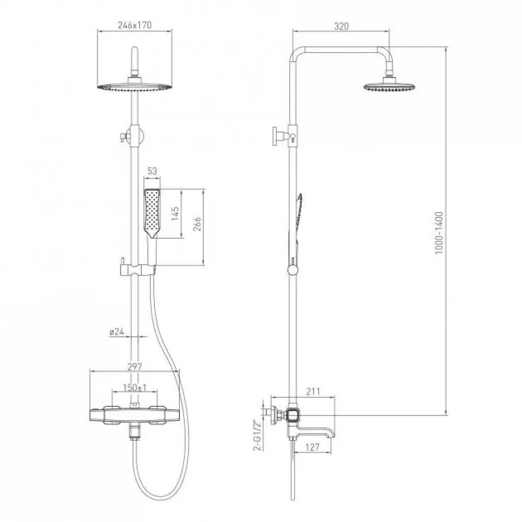 Монтаж: НастіннийОсновний колір/тип покриття: Хром/Темно-сірийТермостат для ванниДовжина виливу, мм: 127Форма лійки ручного душу: ПрямокутнаШирина лійки верхнього душу, мм: 246Форма лійки верхнього душу: ПрямокутнаКількі...