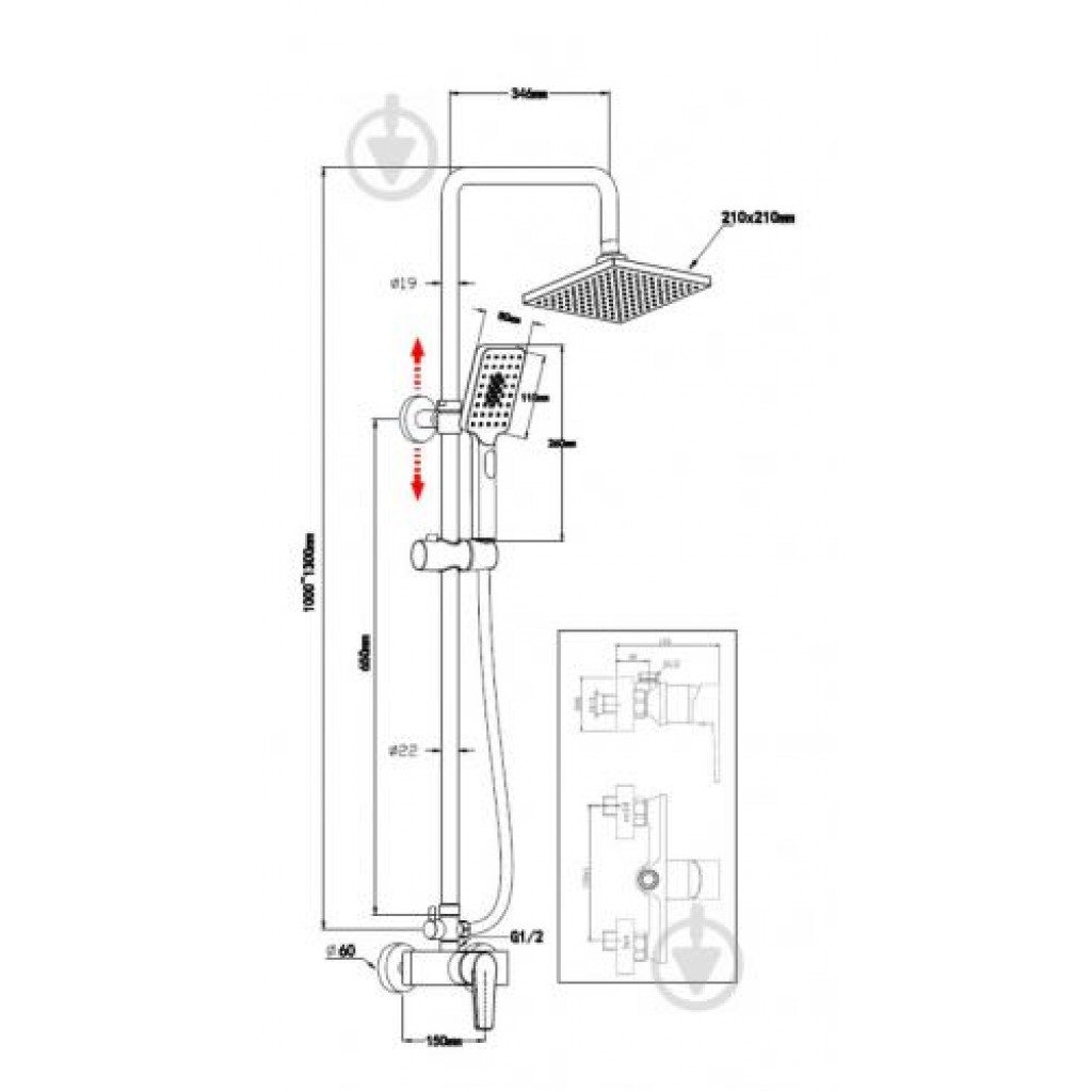 Комплектація: змішувач/потолочна лійка d=210mm/ручна 3-режимна лійка/душова штанга/душовий шланг 150 см/тримач лійки