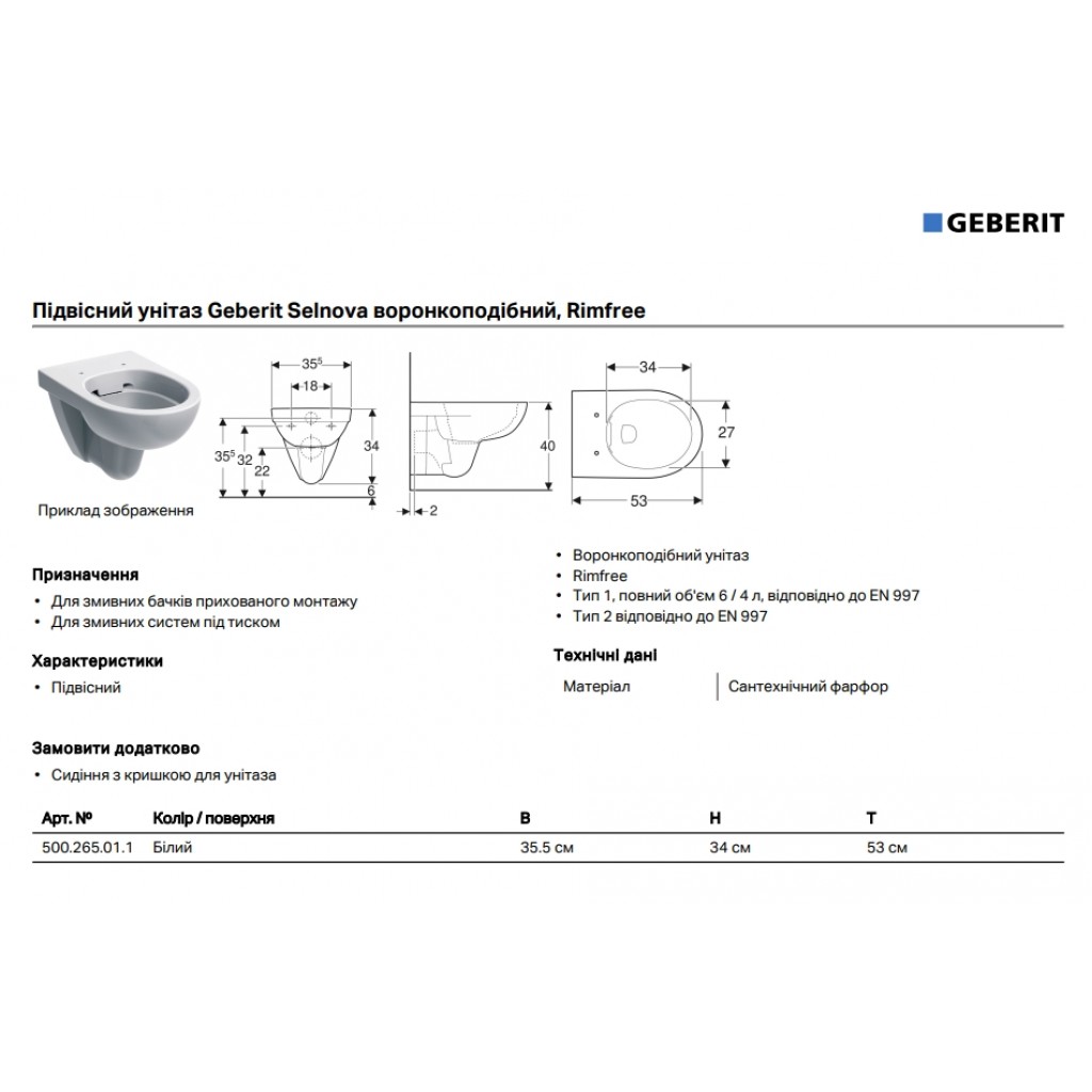 УНІТАЗ ПІДВІСНИЙ GEBERIT SELNOVA З КРИШКОЮ, БІЛИЙ (500.265.01.1/500.333.01.1)