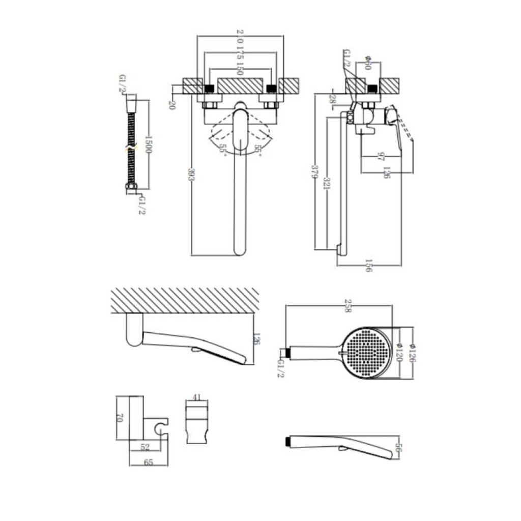 Змішувач, лійка для ручного душу, душовий шланг, кронштейн для ручного душу, кріплення.