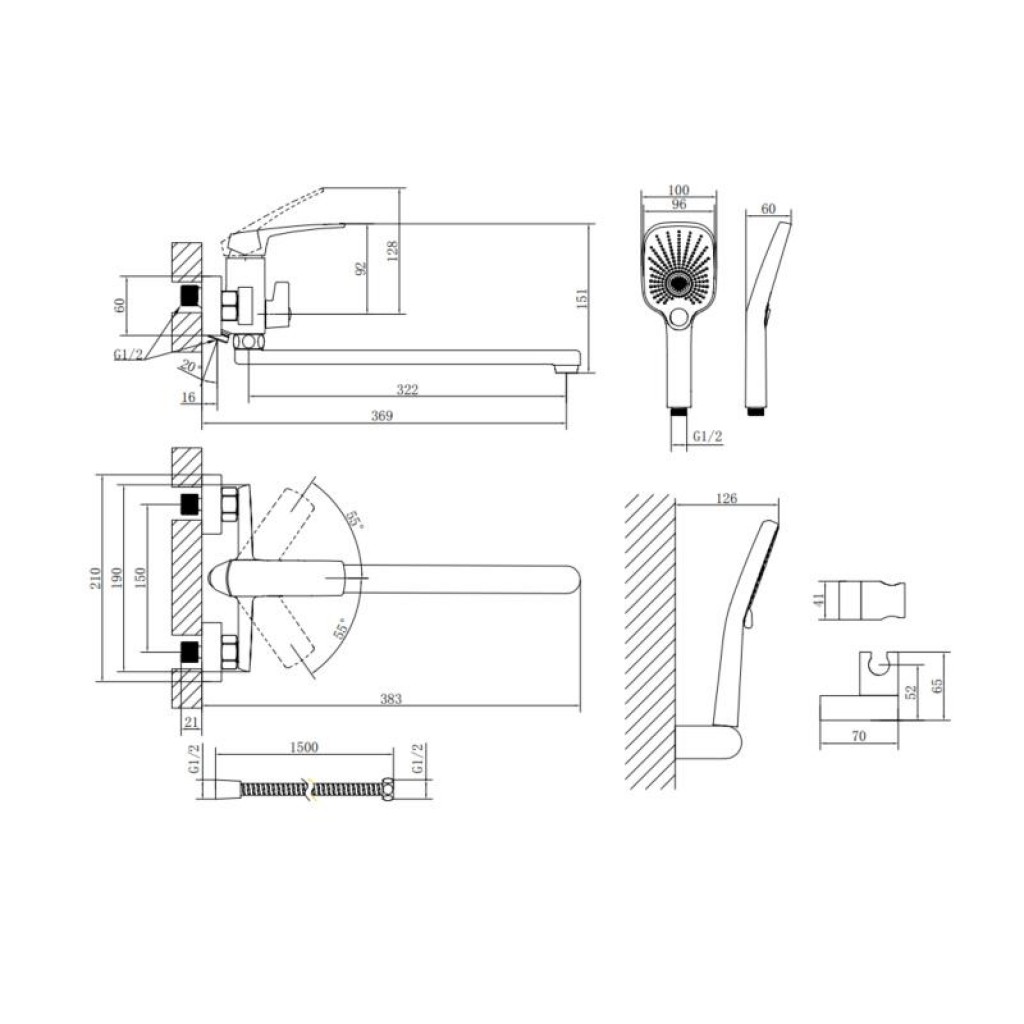 Змішувач, лійка для ручного душу, душовий шланг, кронштейн для ручного душу, кріплення.
