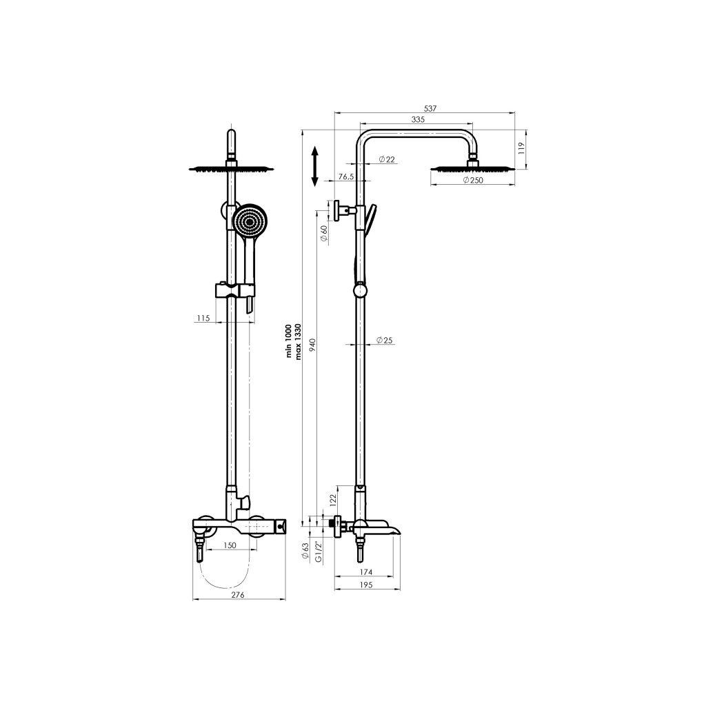 Стационарный верхний душ, душевая колонна и комплект креплений к ней, крепежные элементы, душевая лейка ручного душа, душевой шланг, переключатель ручной лейки/верхний душ, смеситель